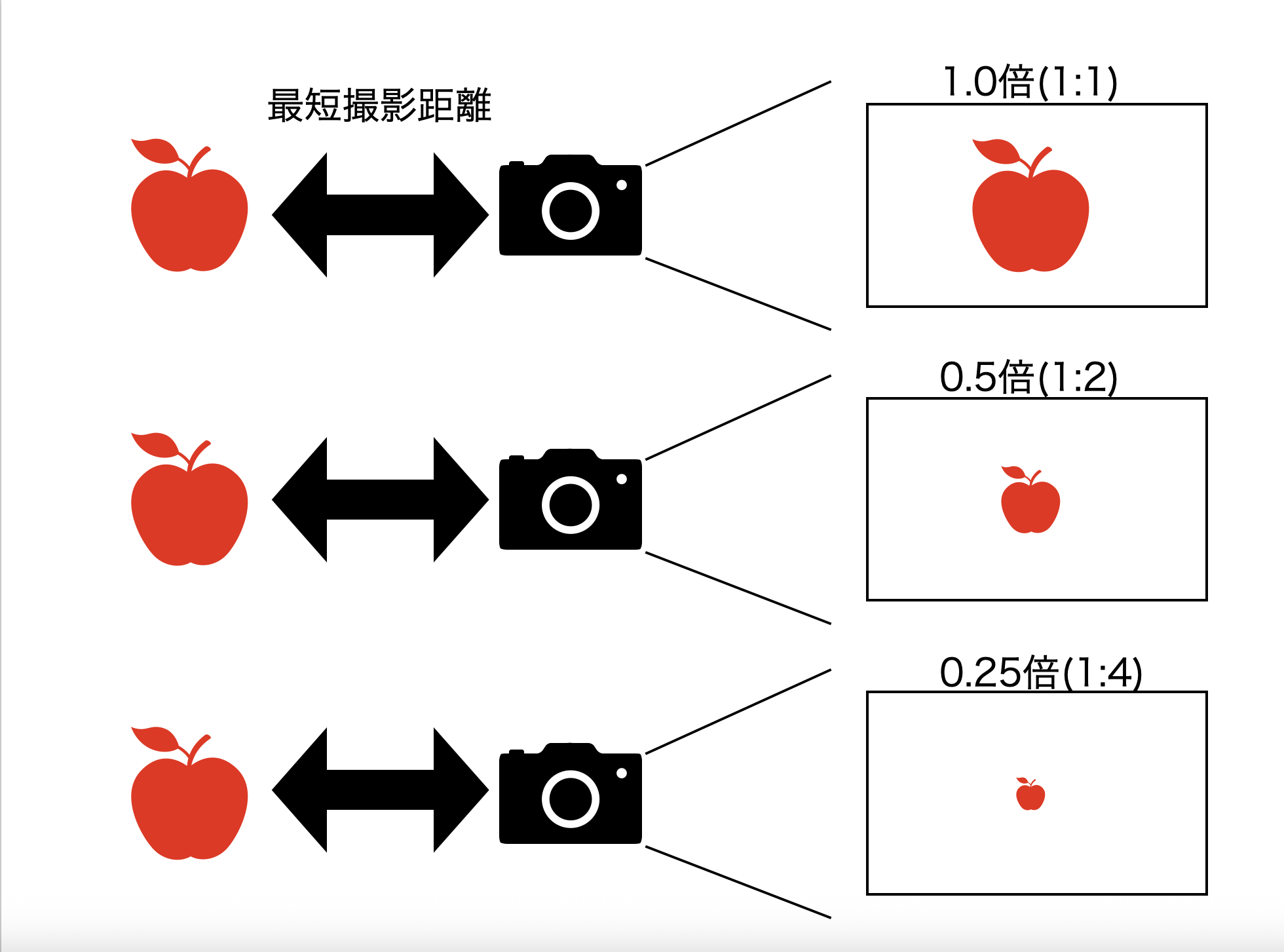 最短撮影距離で実際の被写体の大きさと、カメラのセンサーに写る大きさの比率を表しています。