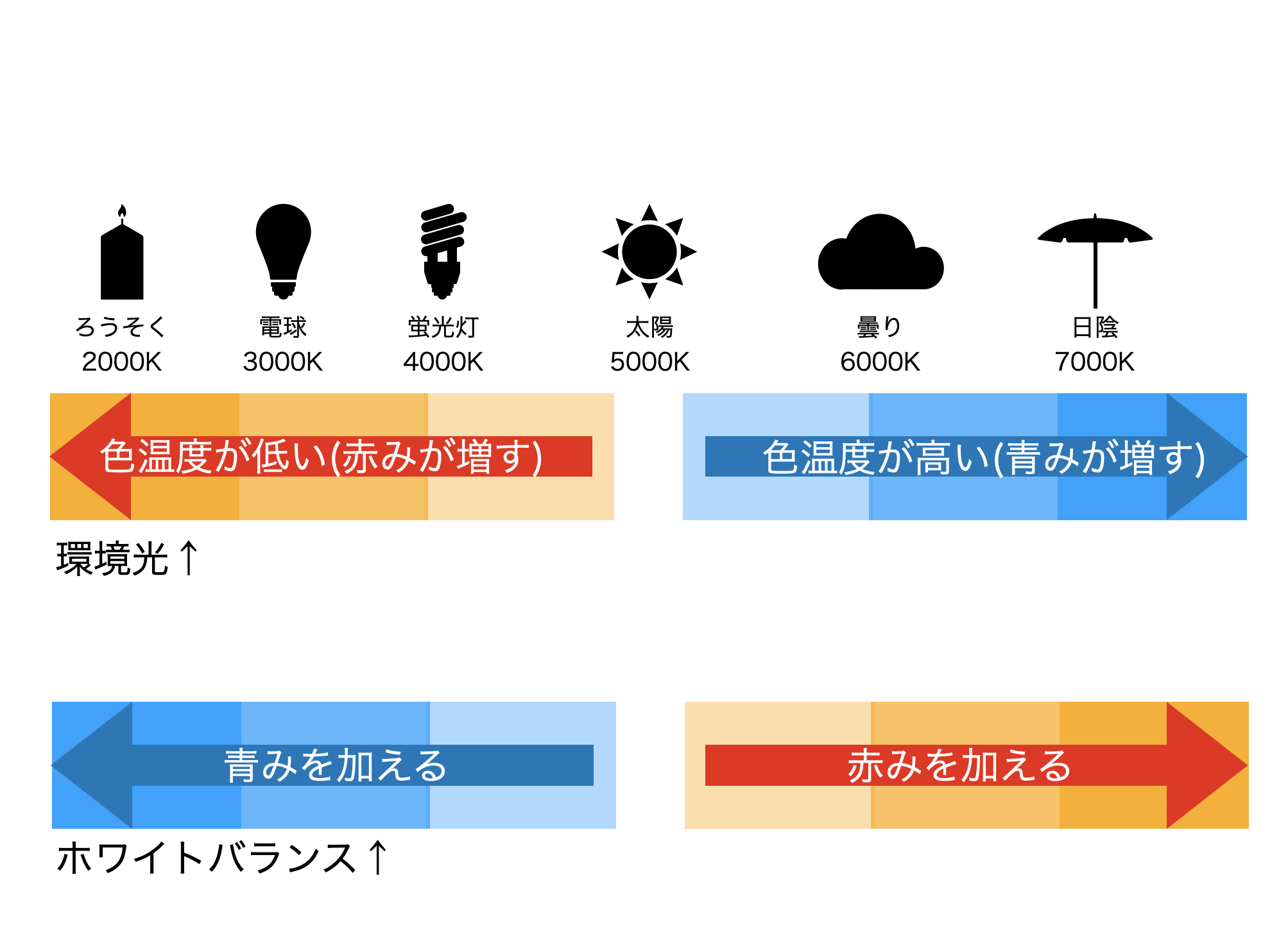 実際の環境光は、ケルビン値が低いほど暖かい色、